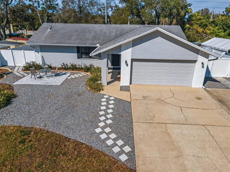 This picturesque Palm Harbor home boasts the sweeping curb appeal you’d expect to find in such a sought-after enclave. With 3 bedrooms, 2 full baths, and a 2-car garage, this ranch style/block construction home features a 3-car driveway that borders several tiled walkways: one leads to a spacious concrete patio, another to an inviting covered porch, and the third to a spectacular yard enclosed with a vinyl fence. A custom-built, screened lanai (with hurricane shutters) makes for a true retreat with ample room for dining, relaxing, and even space for your workout equipment. A serving port from the kitchen and a beautiful set of French doors from the formal dining room elevate the space to an entertainment destination for holidays and milestone celebrations. A huge stone patio extends well beyond the lanai’s footprint into the yard, reaching along both sides of the home lending tremendous design flexibility to this alfresco haven. There’s even the ideal construct to accommodate a cozy firepit. Inside, cathedral ceilings lend drama to the Great Room plan displaying a picture window and set of doors revealing the lanai. This expansive space allows an endless array of furniture configurations. The light and bright eat-in kitchen is well appointed with tons of storage space and a large pantry; the interior laundry room is fitted with newer appliances, plenty of cabinetry, and a utility sink. The split floor plan encompasses all three bedrooms which are carpeted and outfitted with generous closets, while the second bath was COMPLETELY RENOVATED with contemporary stylings. Only a quick drive to the famous Caladesi Island State Park, Honeymoon Island, eclectic Dunedin, Pinellas Trail, (the forty-seven-mile, multi-use pathway that runs from St. Petersburg to Tarpon Springs), and the unparalleled Clearwater Beach -- The Hammocks subdivision in Pinellas County is not in an evacuation zone and benefits from the stellar school district. An assumable VA loan with low interest is available for qualified buyers. This home on Foxcroft Drive has it all!